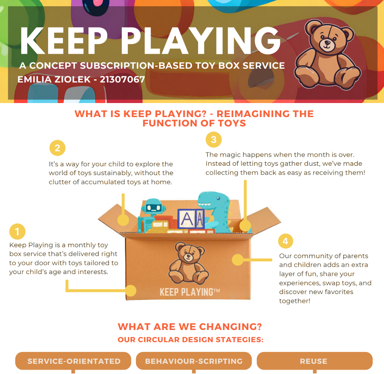 This concept for a subscription toy box service aims to reimagine the function of toys by providing sustainable practices to eliminate the problems that we currently face in the toy industry around the world.